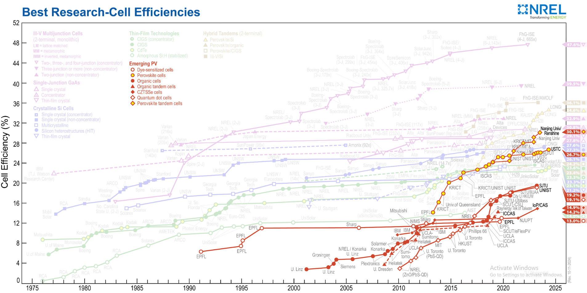 | Fig. 1:Graph showing the best tested cell efficiencies by year, highlighting the emerging PV technologies like perovskite cells shown in orange highlighted yellow. [11] (Courtesy of the DOE.) |
