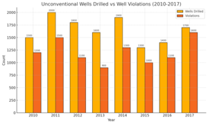 | Fig. 1: Trends in Wells drilled and violations in Pennsylvania from 2010 to 2017, as reported by ECONorthwest. [4] (Image Source: S. Banerjee.) |
