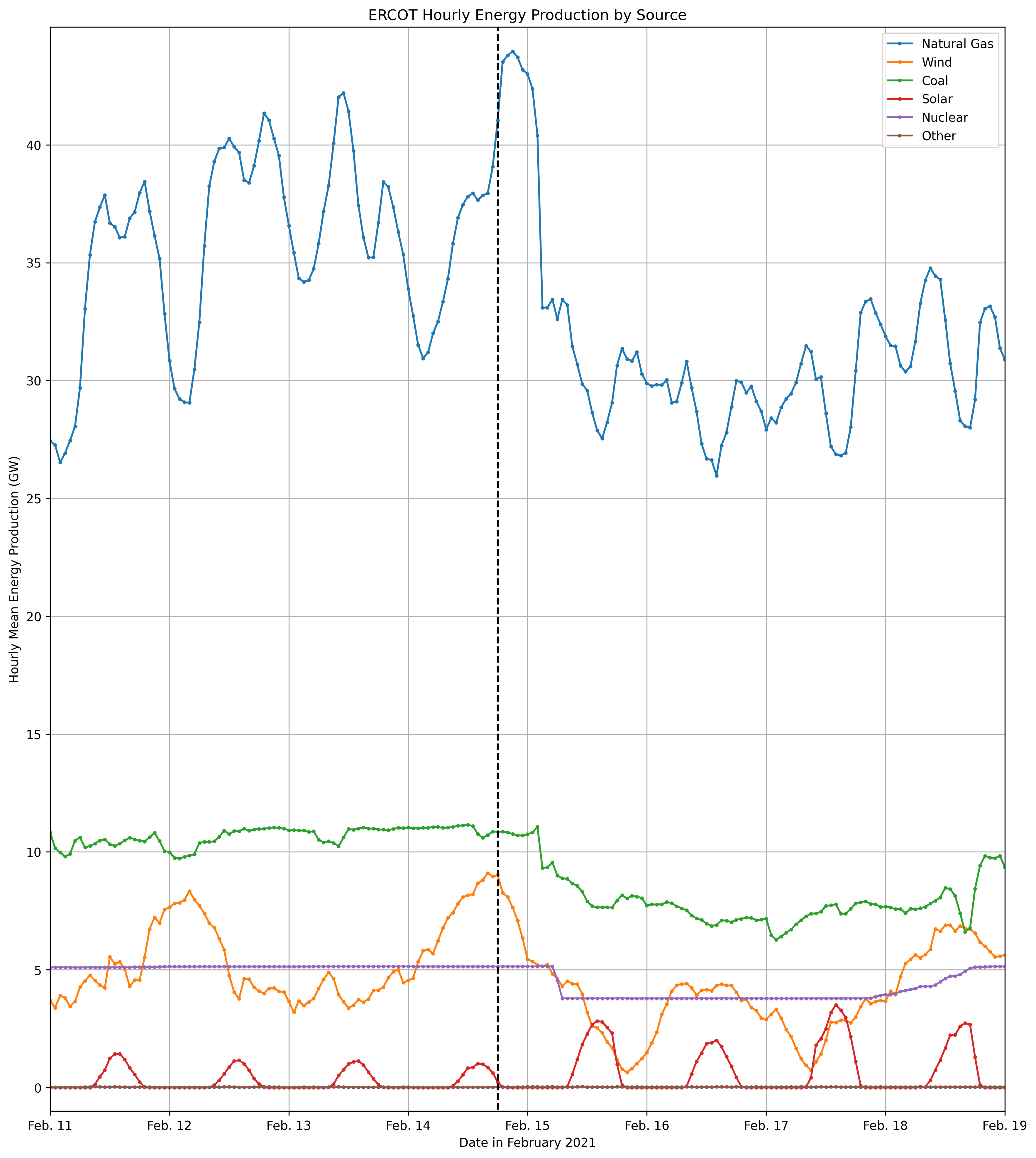 At around 6 PM on the evening of Feb 14, 2021, Winter Storm Uri hit Texas. [2] Shortly thereafter, the total load being supplied by the system falls by approximately 20 GW, about a third of its per-storm value. [3,4] The onset of the storm is shown in Figs. 1 and 2 as a vertical dashed line. Around this time, we can observe two important events. First of all, as the storm begins, total power generation actually increases, with most fulfilled by natural gas generation. This increased electricity consumption may be predominantly explained by customers turning on the heat as outdoor temperatures dropped. [2] Then, as the 14th of February turns into the 15th of February, energy generation from a number of sources begins to rapidly decrease. This is the onset of the power crisis.