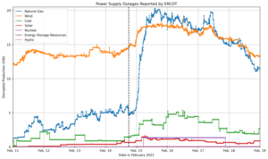 The goal of this report, then, is to explain what happened during the crisis. This is made more complicated by a highly politicized discourse surrounding the crisis: attempts were made to blame either wind or natural gas generation failures for the crisis. [2] Power outage data can be presented in such a way as to appear to support either narrative, generating further obfuscation. This will be explored in some detail below in an attempt to bring clarity.