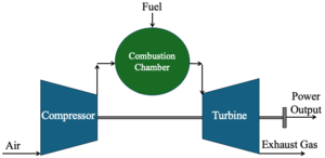 | Fig. 1: Schematic of the jet engine components. There are three major components: the compressor, combustion chamber, and turbine. (Image source: I. Chen, after Saravanamuttoo et al. [3]) |