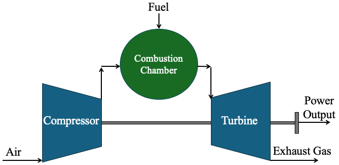 The primary goal of the open-cycle gas turbine engine is to expand gas through rotating blades, converting kinetic and thermal energy to mechanical work. A schematic of the jet engine is displayed in Fig. 1. A gas turbine engine draws ambient air through a compressor to achieve the pressure ratio for expansion in the turbine. After the compression stage, fuel mixed with the air combusts in the combustion chamber brings additional energy to increase the air temperature. The heated gases expand through the turbine which turns blades to drive the compressor on a shared spool to perform the shaft power cycle again. Exhaust gases also spin a generator for electrical power and exhaust out of a nozzle at a high velocity to create thrust. [3]