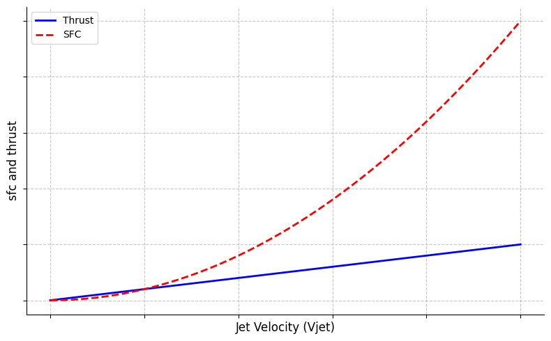 | Fig. 2: Plot comparing the relationship of sfc and thrust to Vjet. Image source: I. Chen, after R. Royce. [4] |