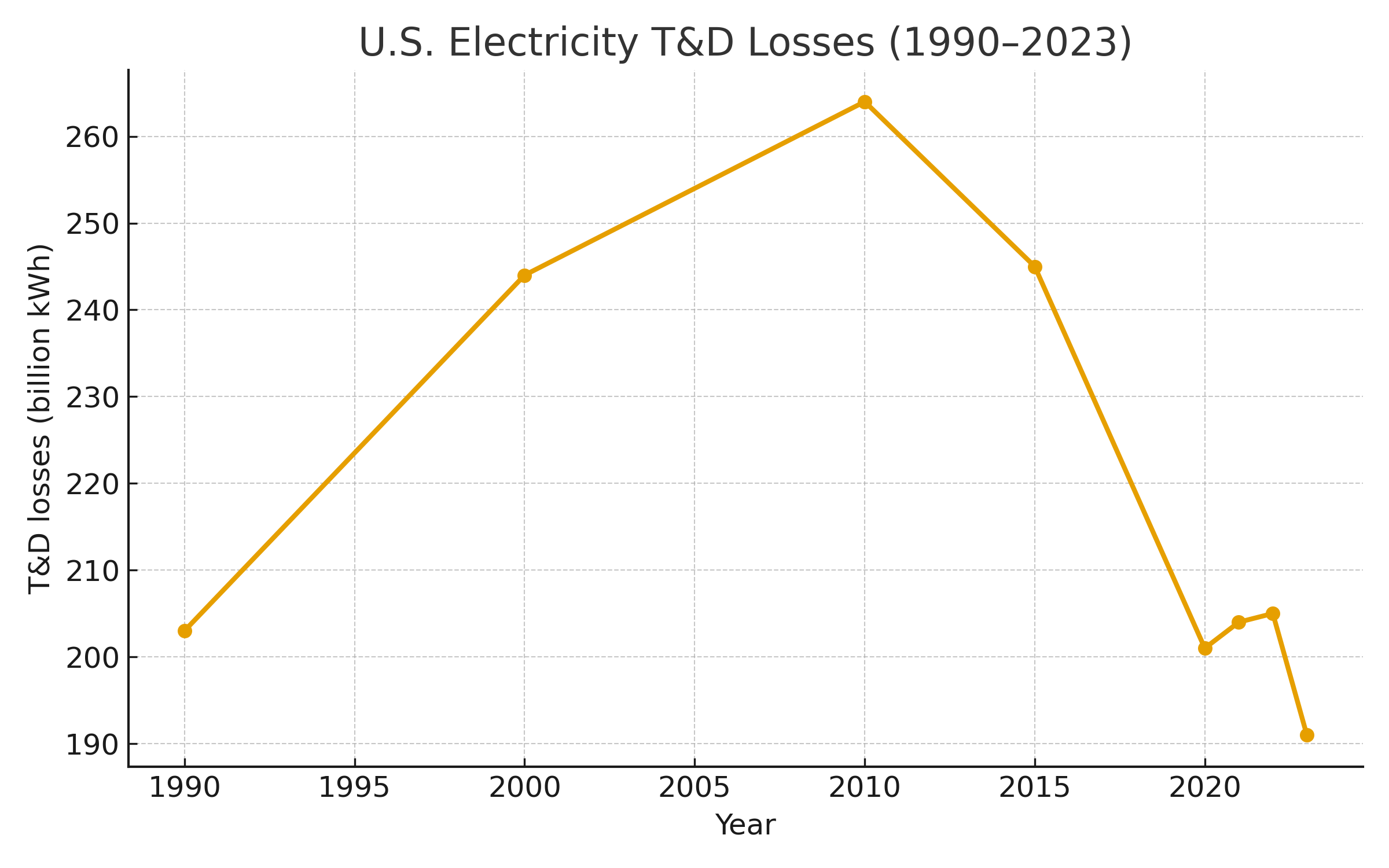 Absolute T&D losses scale with system size, loading patterns, and infrastructure vintage. MER Table 7.1 values indicate that U.S. losses (including unaccounted for) were on the order of a quarter-trillion kilowatthours in the early 1990s and have remained in the 200-260 TWh band in subsequent decades, even as total generation increased and operational practices improved. [1] In the most recent interval, totals near 190-210 TWh are common (see Fig. 1 for selected years, 1990-2023). [1] The long-run tendency is that the fraction of electricity lost has converged toward the mid-single digits, a pattern consistent with widespread use of higher-voltage backbones, improved transformer fleets, and more sophisticated system operations. [2,3]
