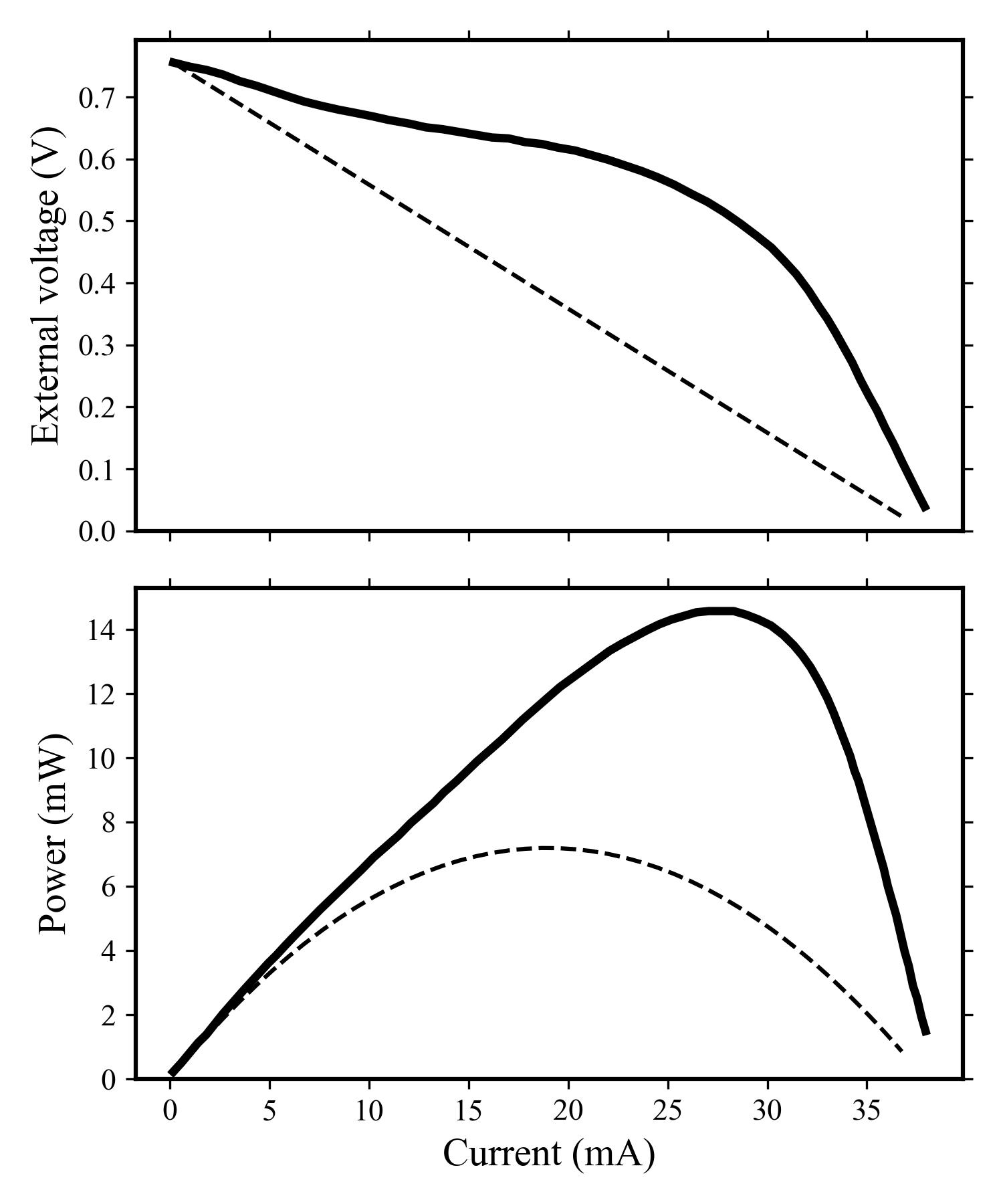 The quadratic dependence of the power on the current I implies that there is some finite current (or, equivalently, some finite load) that corresponds to a maximum in the power density. Additional non-Ohmic losses will distort the shape of this power vs. current curve, but it will in general be the case that the external voltage is some decreasing function of current, placing an upper bound on the obtained power (see Fig. 2). [7] Both the maximum power and the corresponding current are typically quite small, taking values < 1 W and < 1 A, respectively.
