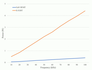 | Fig. 1: Frequency versus switching loss for GaN HEMT and Si IGBT. [6] (Image source: Z. Jahan) |