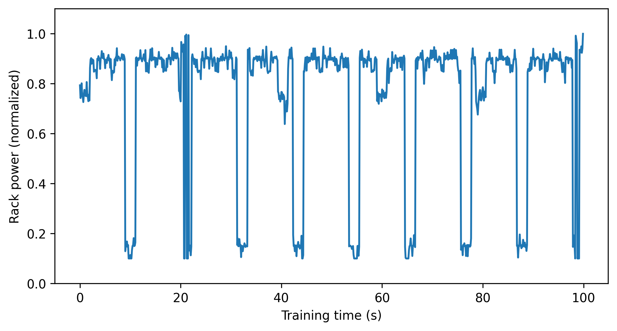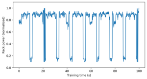 | Fig. 1: Example of a rack's power use while training an AI model. Values are normalized as a proportion of the rack's maximum rated power use. (Image source: D. Jensen) |