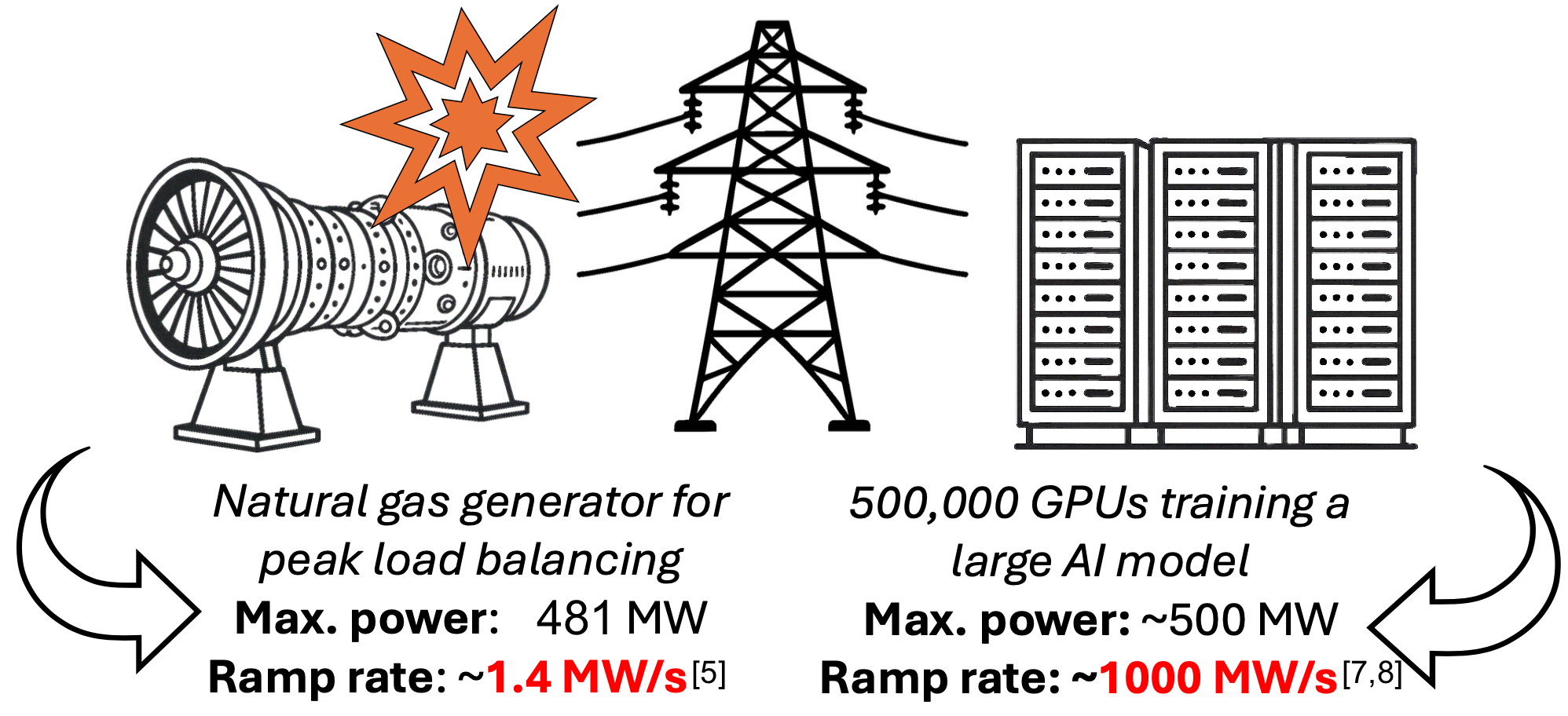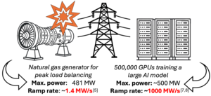 Experimental measurements reported by the North American Electric Reliability Commission (NERC) demonstrated that an AI training cluster can transition from its maximum rated to minimum power in roughly 500 milliseconds. [7] Next-generation AI models could reasonably demand upwards of 500 MW computational power during training. [8] A 500 millisecond transition to full power would require a ramping rate of 1000 MW/second. For comparison, the grid-balancing natural gas turbine has a maximum power output of 481 MW, with a maximum ramping rate of 1.42 MW/second, nearly three orders of magnitude too slow to compensate for the AI-training power ramp. [5]
