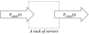 Thinking just on the level of a single rack of computers in a datacenter, Fig. 3 illustrates how the energy added to the rack comes from the power grid, while energy leaves the system as the computers and their supporting systems do work. If the power added to the rack is not equal to the power leaving the rack, there has to be some energy either being stored in or discharged from the rack.