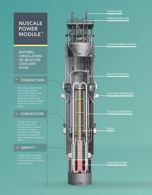 | Fig. 1: Diagram of a NuScale small modular reactor showing the containment vessel and internal components. (Source: Wikimedia Commons) |