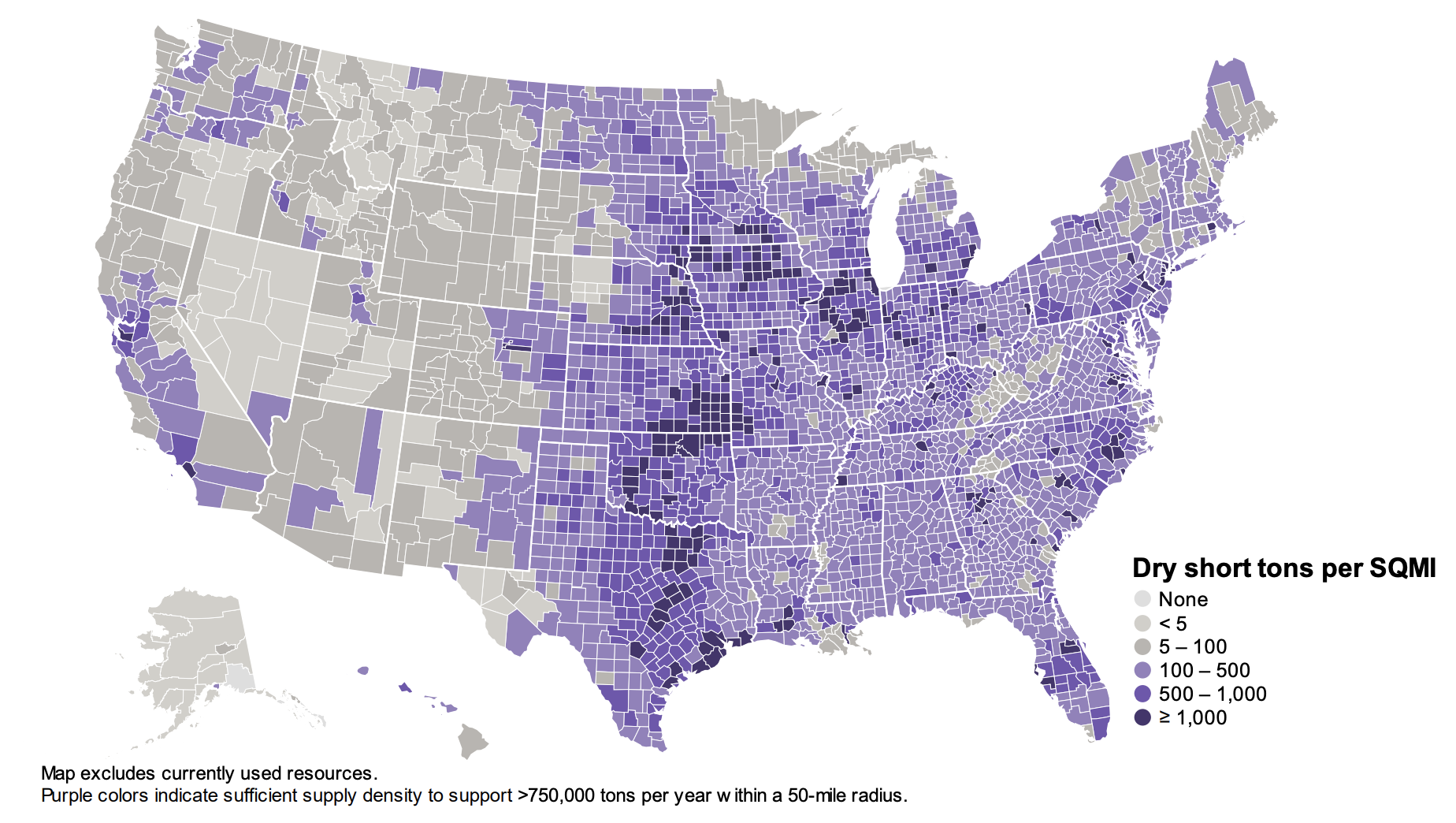 | Fig. 1: Spatial distribution of biomass resources from all sources shown in the mature-market medium scenario (unit: Dry short tons per SQMI). [1] Purple shades indicate adequate spatial density to support a facility of at least 725,000 dry tons per year within a 50-mile radius (i.e., at least 100 dry tons per square mile). (Courtesy of the DOE.) |
