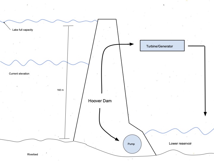 Given its size, elevation, and structure, Hoover Dam shows potential for converting an existing hydroelectric facility into a pumped-hydro storage system. In this model, water would be pumped from the downstream reservoir back into Lake Mead during off-peak hours, turning the dam into a battery. However, water is scarce in this region, raising the question: does the value of energy outweigh the market of water being cycled?