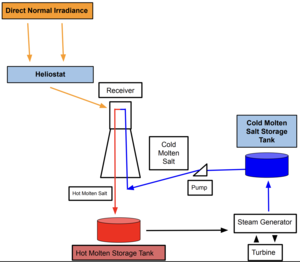 A molten-salt system typically is made up of a cold tank and hot tank. The cold tank holds salt at the lower end of the operating temperature and a hot tank stores salt after heating. During charging, cold molten salt is pumped upward to a heat source that raises the temperature. The heated salt then flows down into the hot tank for storage. [5] Hot molten salt from the hot tank is pumped into the evaporator to heat the water for producing steam, which runs the turbine to generate electricity. This dual tank configuration ensures the continuous power generation even during nighttime and cloudy days. The molten salt stored in the hot tank can sustain operation for hours. [5]