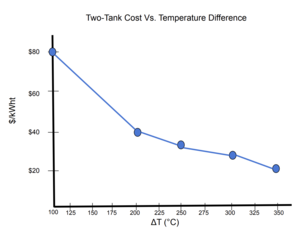 | Fig. 2: Thermal energy storage cost as a function of operating temperature difference for multiple molten-salt configurations. (Image source: N. Ly, after Jacob et al. [12]) |