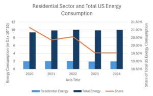 Energy use in residential buildings plays a significant role in the United States total energy consumption. Households require energy for heating, cooling, lighting, appliances, and more, and as climate patterns shift and residential energy demand follow suit, understanding residential energy consumption is critical for identifying opportunities for savings and emissions reductions. Quantifying how much energy homes and residential buildings use can help provide a baseline for evaluating progress in household energy efficiency and emissions reductions efforts. This report will focus on the annual total energy consumption from residential buildings in the United States since the turn of the decade (year 2020-2024), measured in gigajoules (GJ), and then analyze its relative % contribution to the total U.S. energy consumption throughout the same time period. As I analyze the residential sector - total energy consumption trend, I will ask the following questions: Is the share of total U.S. energy consumption attributed to the residential sector increasing, decreasing, or remaining stable between 2020 and 2024? If there is a change, is it statistically significant?