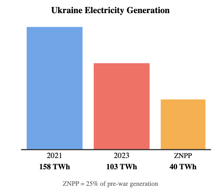 | Fig. 1: Ukraine electricity generation comparison showing Zaporizhzhia's 40 TWh represents 25% of 2021 pre-war output and 39% of 2023 wartime generation. [4] (Image source: N. Oliinyk) |