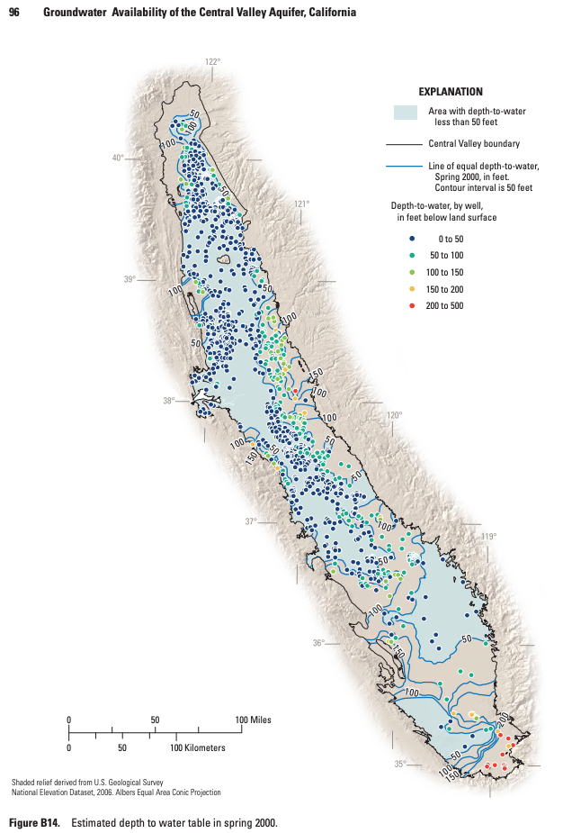 | Fig. 1: Estimated depth to water table in Central Valley in 2000. [2] (Courtesy of the USGS) |