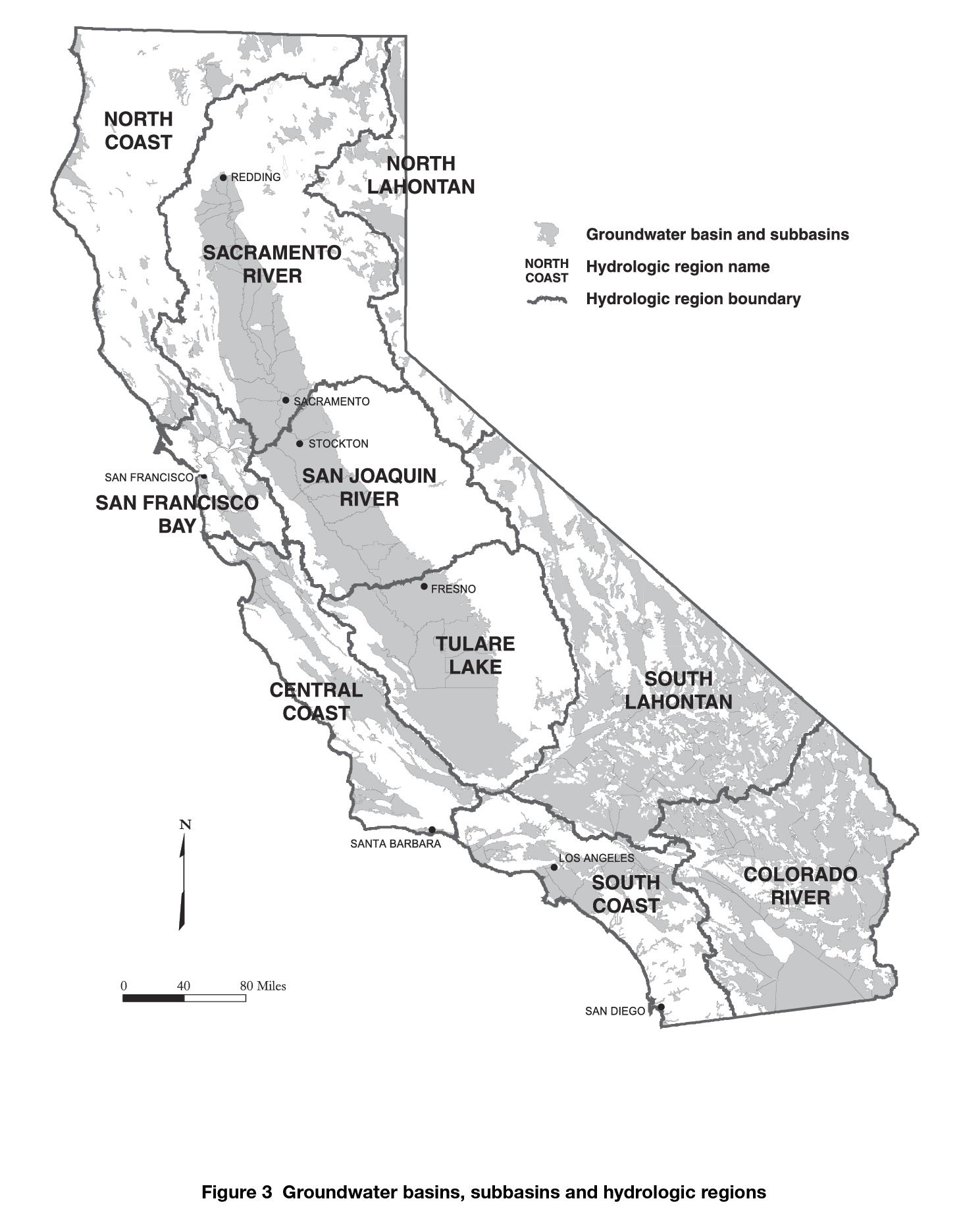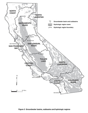 | Fig. 2: California hydrologic regions. [1] (Source: Wikimedia Commons) |