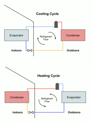 Heat pumps operate on a four-stage cycle that consists of compression, condensation, expansion, and evaporation. (See Fig. 1.) During this process, a refrigerant changes phase as it captures thermal energy from a heat source, in the case of air-source residential heat pumps this is the air outside. The refrigerant then goes through the reverse phase transition as it delivers this energy to a heat sink, which would be the air indoors. A four-way valve enables the refrigerant flow to be reversed, allowing the system to extract heat from interior spaces and reject it outdoors for space cooling. This reversibility makes heat pumps versatile year-round climate control systems. [2]