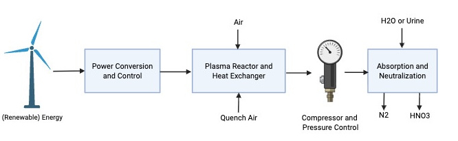 | Fig. 1: Process Flow Diagram for Cold Plasma Nitrogen Fixation. (Image source: A. Sazi, after Chen et al. [10]) |