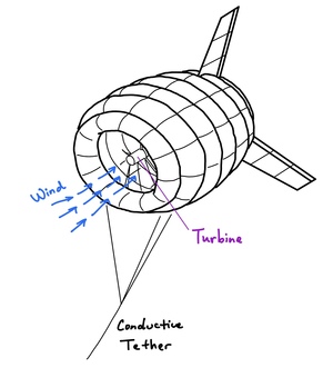 Fig. 1 illustrates how a buoyant air turbine works. A buoyant shell filled with helium gas lifts the turbine to high altitudes where the wind is stronger and steadier. [1] The central turbine spins as the wind blows through and collects power. A few tethers connecting the BAT to a ground station carrier electrical current generated by the turbine. The power can thus be transmitted to local power grids. The tethers also serve to control the height of the BAT.
