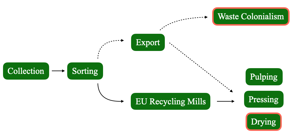 This pattern reflects a form of waste colonialism, in which wealthier regions shift environmental and social costs onto countries with weaker regulatory protections. In India, large portions of the recycling chain remain informal, with collection and sorting often handled by unregulated workers and enterprises. [3] These conditions create uncertainty about whether exported paper is recycled safely, efficiently, or at all.