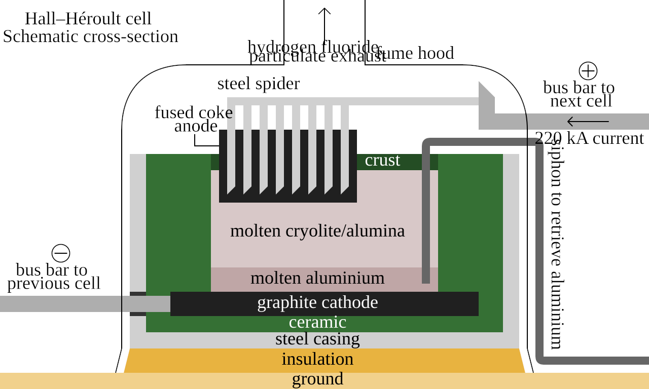 | Fig. 1: The Hall-Héroult process for aluminum electrolysis. (Source: Wikimedia Commons) |
