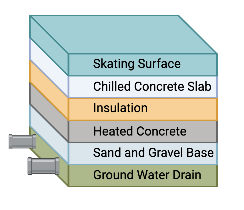 | Fig. 1: Diagram of an ice rink's layers. [2-4] (Image source: A. Zhou.) |