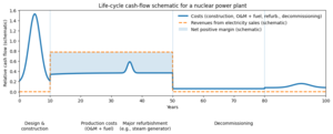 | Fig. 1: Life-cycle cash-flow schematic for a nuclear power plant. (Image source: P. Dedeler, after Erdogdu. [6]) |