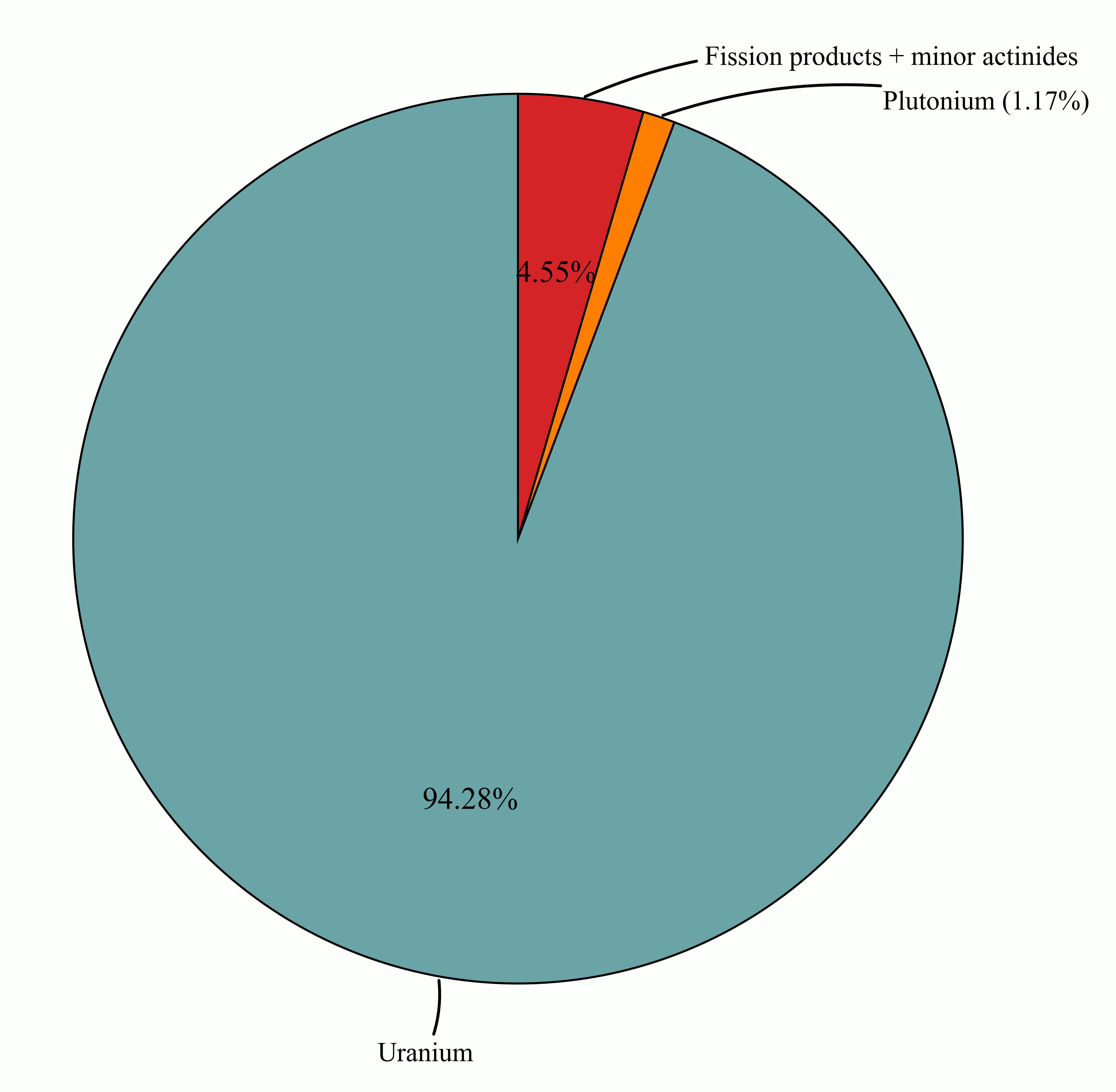 As shown in Fig. 1, the spent-fuel mass is overwhelmingly uranium, with plutonium, minor actinides, and fission products constituting a small fraction of the total mass. Commercial reprocessing is designed for the large, easily recoverable U/Pu streams, however not for perfectly isolating the tiny chemically difficult fraction that dominates the deeper waste argument. [4,5]