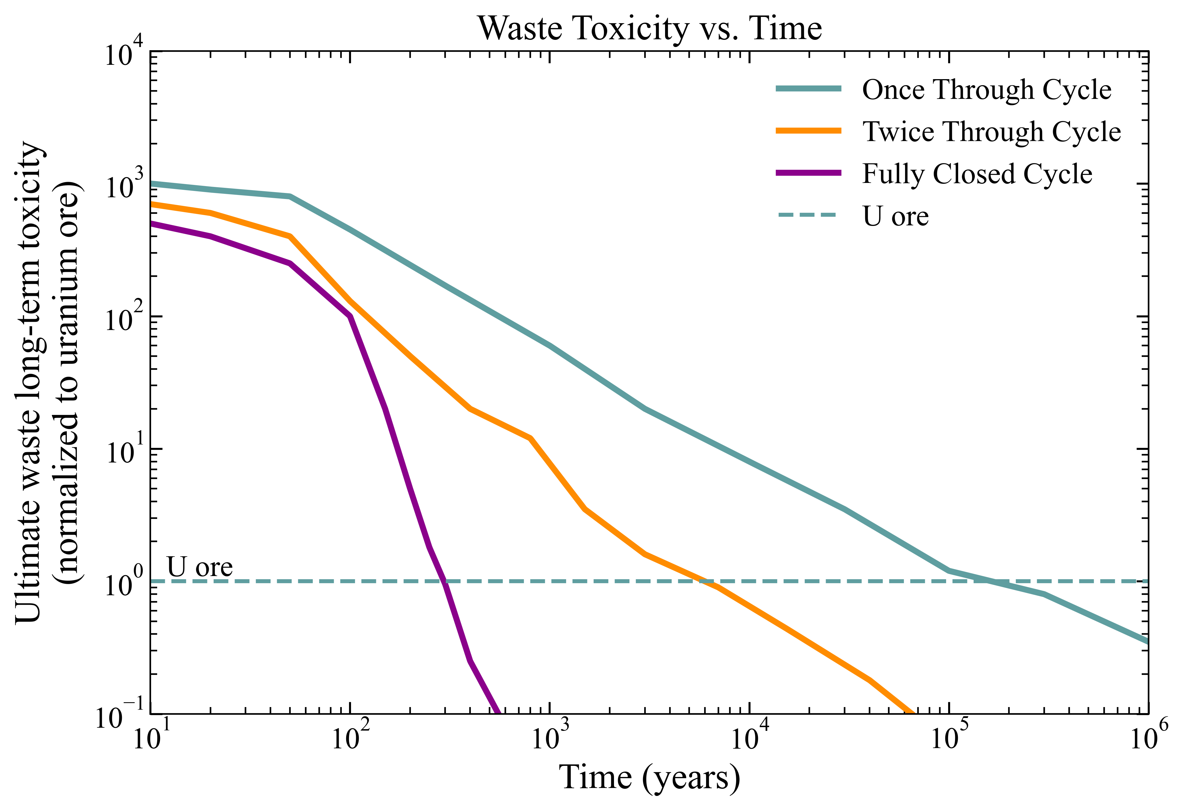 Taken together, Figs. 1 and 2 show the nuclides that dominate the most difficult long-term waste burden represent only a small fraction of the total spent-fuel mass, which is the central paradox of spent-fuel management. In Fig. 2, the once-through case remains above the uranium-ore reference line for an incredibly long time, the twice-through case slightly improves on this, and only the fully closed case produces a much more dramatic reduction in long-term toxicity. In this case, the "twice-through" scenario corresponds to a limited recycle strategy, while the "fully closed" case represents a much more ambitious cycle with much deeper actinide management. [5]