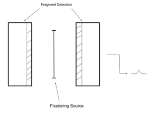 In a typical experimental setup Fig. 1, a fissioning source is positioned between two solid-state surface barrier detectors placed symmetrically on either side. The detectors, fabricated from n-type silicon, record pulse-height signals as charged fission fragments deposit energy in the detector material. A fast coincidence requirement ensures that only fragment pairs originating from the same fission event are recorded. The individual fragment kinetic energies are then reconstructed, and the total kinetic energy released in a single fission event is obtained from their sum. [3]