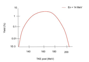 In experiments, the energy released in nuclear fission is the kinetic energy of the fission fragments. The fission process releases approximately 200 MeV of energy, and the majority of this energy appears as the total kinetic energy (TKE) of the fragments. Experimental studies show that almost 80 % of the fission energy is carried by the fragment kinetic energy, while the remaining portion is distributed among prompt fission neutrons, gamma emission, delayed neutrons, and β decay. [1]