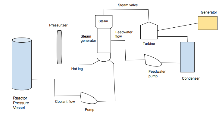 Although increasing turbine steam temperature would raise the thermodynamic efficiency of commercial nuclear power plants, nuclear reactors operate at significantly lower steam temperatures than modern coal-fired power plants, which can exceed 600°C. The operating temperature in light-water reactors is constrained by pressure levels. In pressurized water reactors (PWRs) seen in Fig. 1, the primary coolant circulates from the reactor core to the steam generators under pressures maintained at approximately 15.4 MPa by a pressurizer system. At this pressure, the reactor core raises the temperature of the pressurized water to about 325°C while preventing boiling in the primary loop. [4] This high-pressure requirement is necessary to maintain liquid water for heat removal, so you cannot just continually increase the steam temperature for higher carnot efficiency. Higher pressures increase mechanical stresses on the reactor.