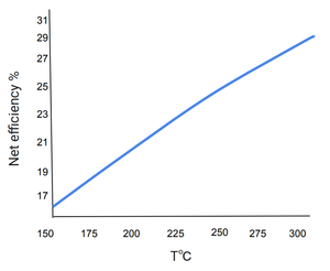 or 47.1%. Even at one of the highest reported steam temperatures for contemporary water-cooled reactors and condenser temperature, the maximum theoretical efficiency remains below 50%. The net electrical efficiency of modern nuclear power plants is typically about 33% of the reactor thermal output. Thus modern commercial reactors operate at approximately 70% of the theoretical Carnot efficiency.