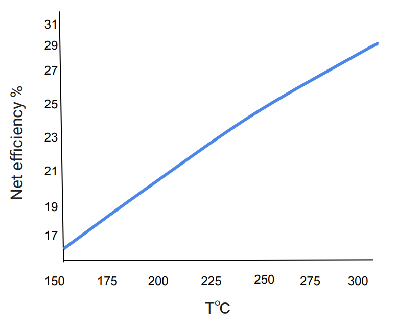 For a target electrical output of 1 GWe the minimum thermal power required under Carnot conditions would be 1 GW / 0.471 = 2.12 GWth. However, using reported commercial efficiencies: we obtain 1 GW / 0.33 = 3.03 GWth. Thus real reactors require approximately 3.03 GWth to produce 1 GWe, significantly above the thermodynamic minimum. The dependence of net efficiency and required operating pressure on turbine inlet temperature is shown in Fig. 2.