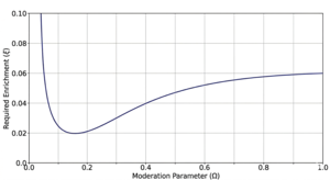 This latter is a condition on the enrichment ξ of the fuel. This means that fraction ξ of the Uranium atoms are fissile U-235, the remaining 1 - ξ being non-fissile U-238. For a given value of Ω we wish to find the minimum value of ξ required to make the reactor just critical with the control rods fully withdrawn. Real reactor fuel must have an enrichment slightly above this value.