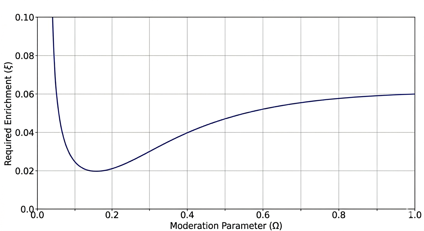 The minimum of the criticality curve occurs at ξ ≈ 0.04 - 0.06, indicating that several percent enrichment in U-235 is required for criticality in light water systems, because absorption in U-238 and hydrogen reduces neutron population. Increasing enrichment strengthens the positive fission term and restores the balance required for sustained chain reaction. The minimum in the enrichmentmoderation curve reflects optimal moderation, where thermalization is sufficient to enhance fission without excessive absorption losses.