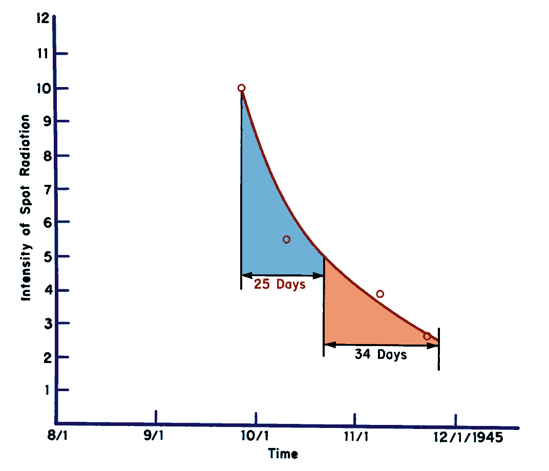 The chain of evidence linking the fogged film to nuclear fallout is described in detail by Webb. [1] Radiation surveys of the suspect cardboard showed strong beta activity, weak gamma emission, and negligible alpha radiation, ruling out natural uranium or radium contamination. [1] The activity decayed with an effective half-life of approximately 32 days, and beta-spectrum measurements showed an end-point energy near 0.6 MeV. [1] These two parameters narrow the possible radioactive nuclei to a small subset of fission products. Webb identified Ce-141 as the most plausible candidate, with half-life T1/2 = 32.5 days and beta end-point energy Eβ,max ≈ 0.61 MeV. [1] The corresponding decay constant is