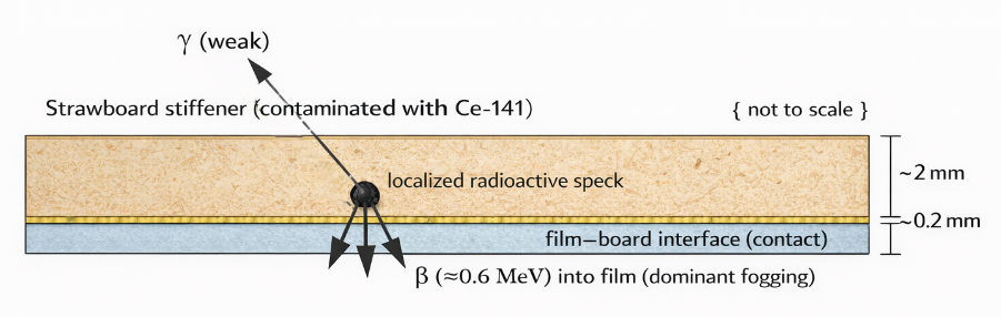 A reasonable order-of-magnitude consistency range can be obtained by assuming an activity in the contaminated surface layer of the strawboard on the order 102 - 103 Bq/g. Since 1 Ci = 3.7 × 1010 Bq, this corresponds to approximately 10-9 - 10-8 Ci/g. For a beta-emitter such as Ce-141 with typical decay energies of order 0.6 MeV (≈10-13 J per decay), such activity would release roughly 10-11 - 10-10 J/s per gram. Integrated over weeks of continuous contact with highly sensitive film, this level of emission is sufficient to produce noticeable fogging, while remaining far below levels associated with acute radiation effects. [3]