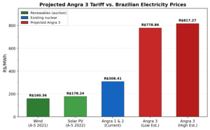 Angra 3's projected tariff of R$778–817/MWh is therefore roughly 4.3–4.6 times the auction price of new wind or solar, and about 2.5 times the tariff of the existing Angra 1 and 2 reactors (Fig. 1).