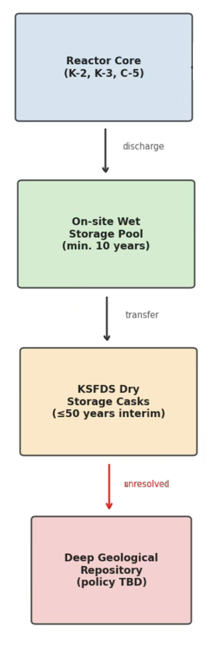 The KSFDS is designated as interim storage only, with a design life of approximately 50 years, pending a future policy decision on either deep geological repository (DGR) construction or reprocessing. Neither a DGR site nor a reprocessing facility has been approved or constructed in Pakistan as of this writing. The long-term disposition pathway for high-level waste from K-2 and K-3 therefore remains unresolved.